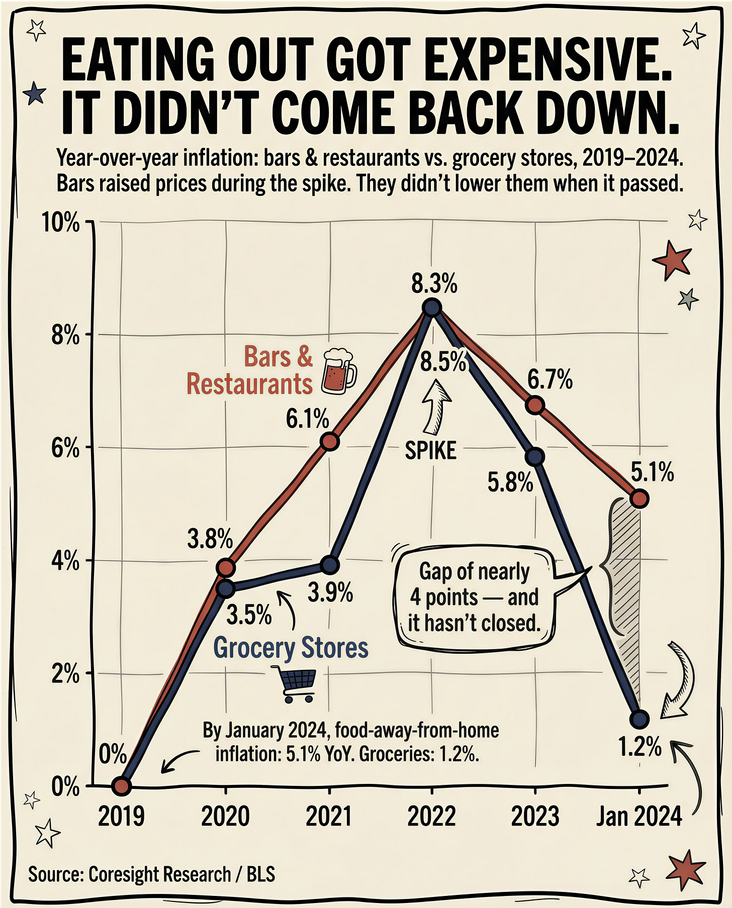 Food-away-from-home inflation was still running at 5.1 percent year-over-year as recently as January 2024, compared to 1.2 percent at grocery stores. Cocktail prices jumped roughly seven percent in 2021 and 2022, and bars largely did not walk them back when broader inflation cooled. Some menus that were at $18 for a cocktail are now at $24. Price is a major factor in determining whether a visit requires a decision. Above a certain threshold, you are always doing the math. You are always justifying the trip. The visit stays an event, no matter how many times you make it.