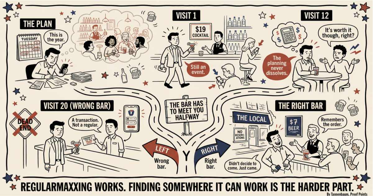 The Business Insider piece on the trend quoted loyalty app founders who were excited about formalizing the behavior: rewards programs, recognition technology, systems to track frequency and signal belonging back to the customer. The framing was that becoming a regular is something that can be engineered through the right incentive structure.