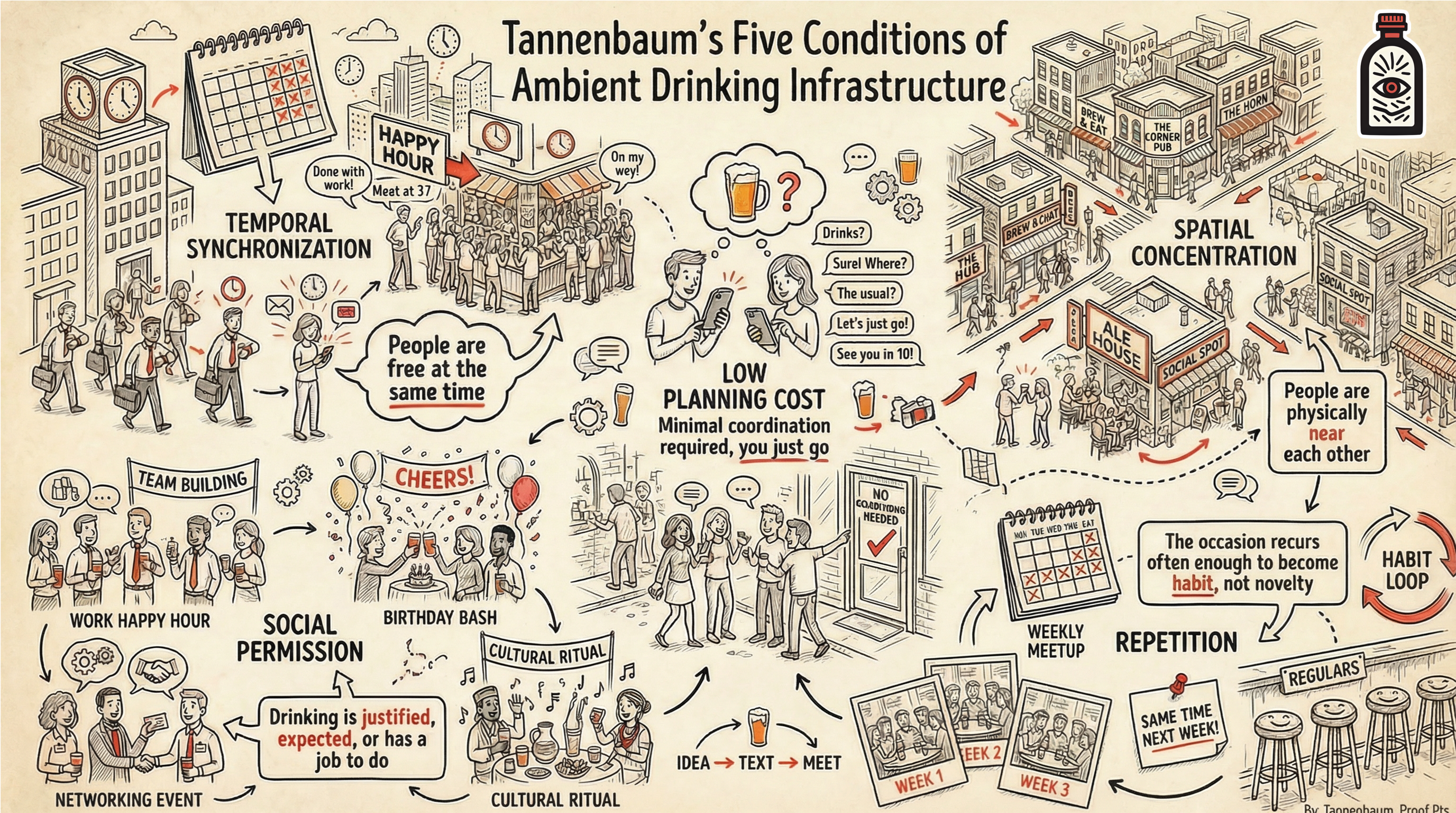 People need to be free at the same time, near each other, near a location, with low enough friction that nobody has to plan it. Even drinking along requires some level of cultural permission. For most of the twentieth century, daily life quietly met those requirements. Now it doesn't as reliably, and the casual moment is the first casualty.