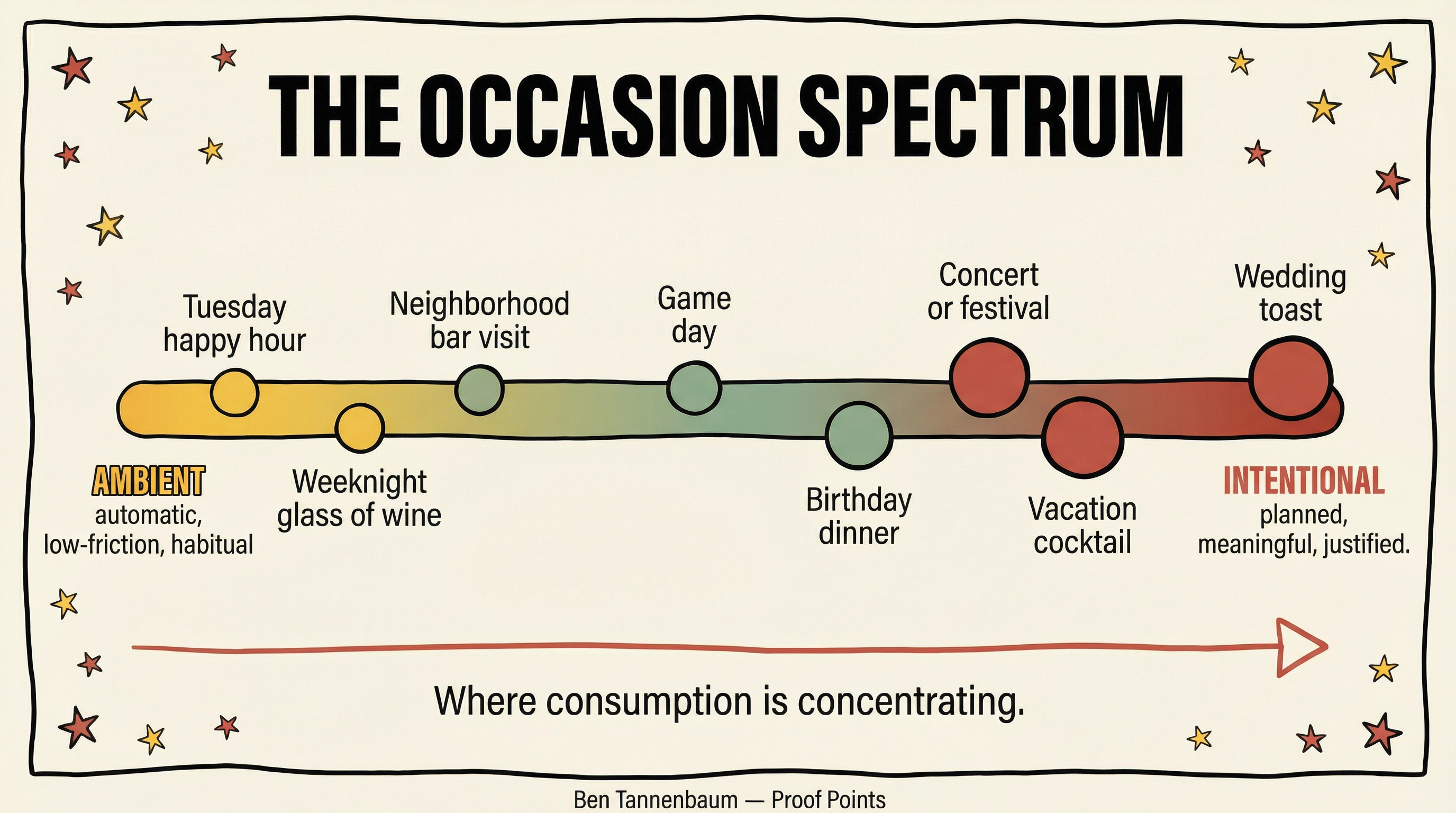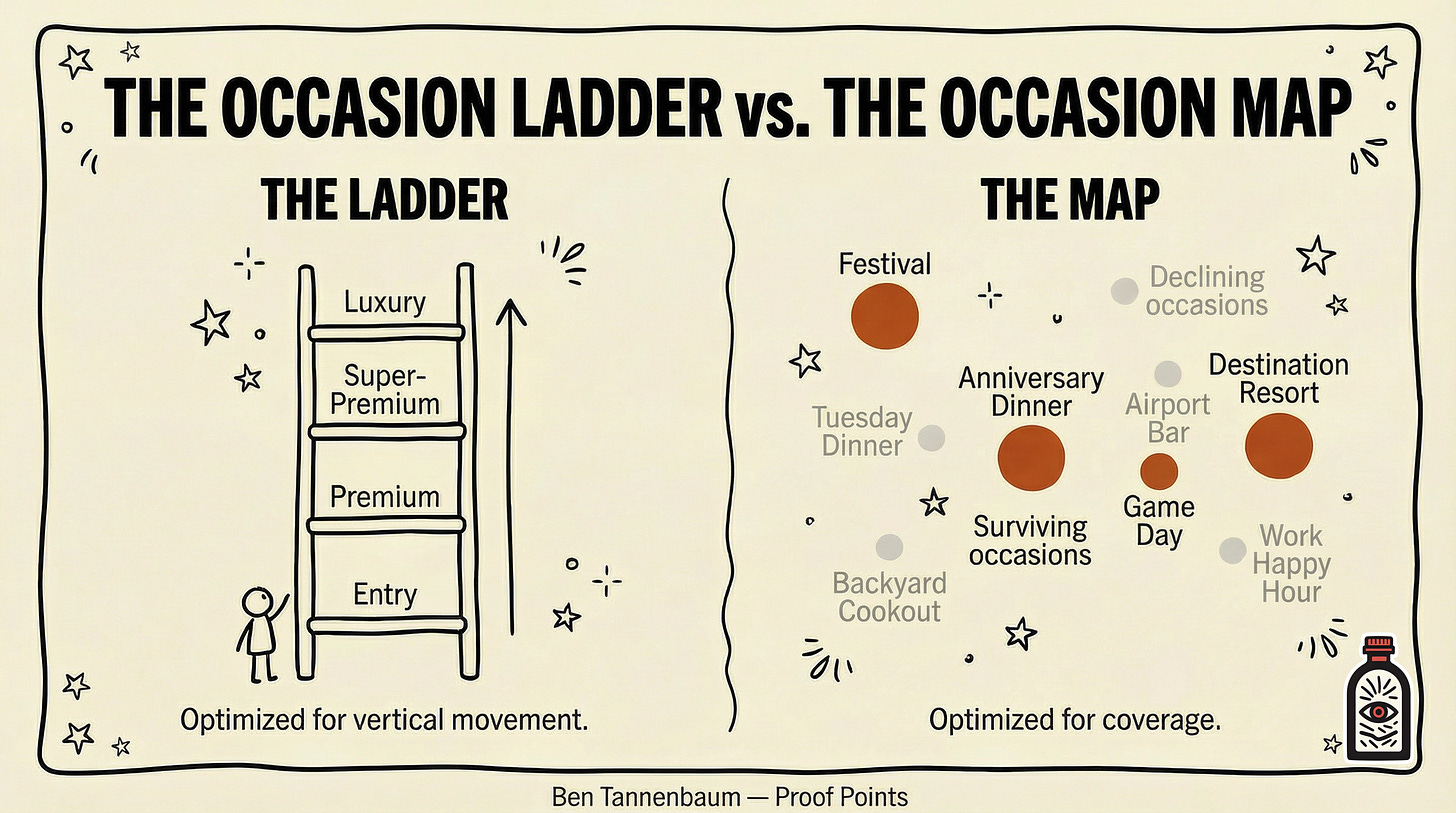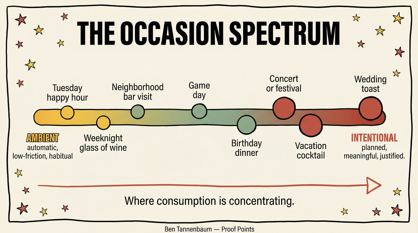 The occasions holding are the ones that carry their own structural weight. Events, travel, celebrations, premium dining where drinking is architecturally embedded. The ones eroding are the ones that used to happen without anyone deciding they should.