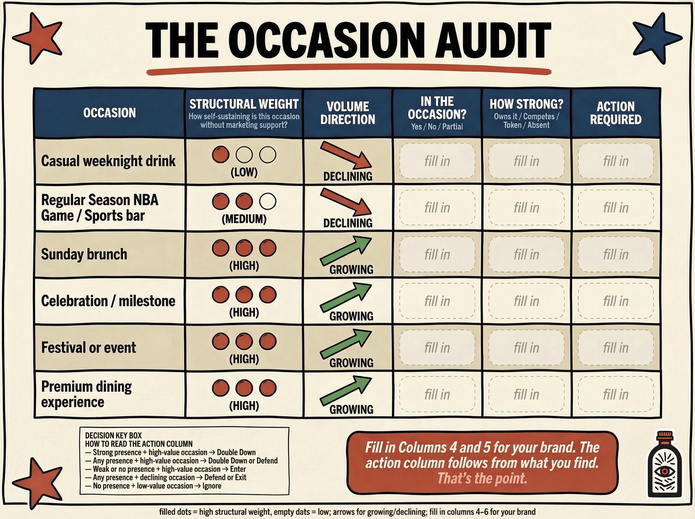 The Occasion Audit below maps six of the occasions relevant to the frequency compression argument, but they represent a fraction of the full landscape brands should be mapping. Fill in the last two columns for your brand. The action column is what informs your strategy.